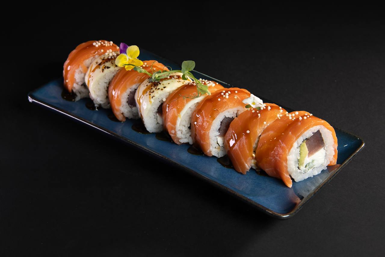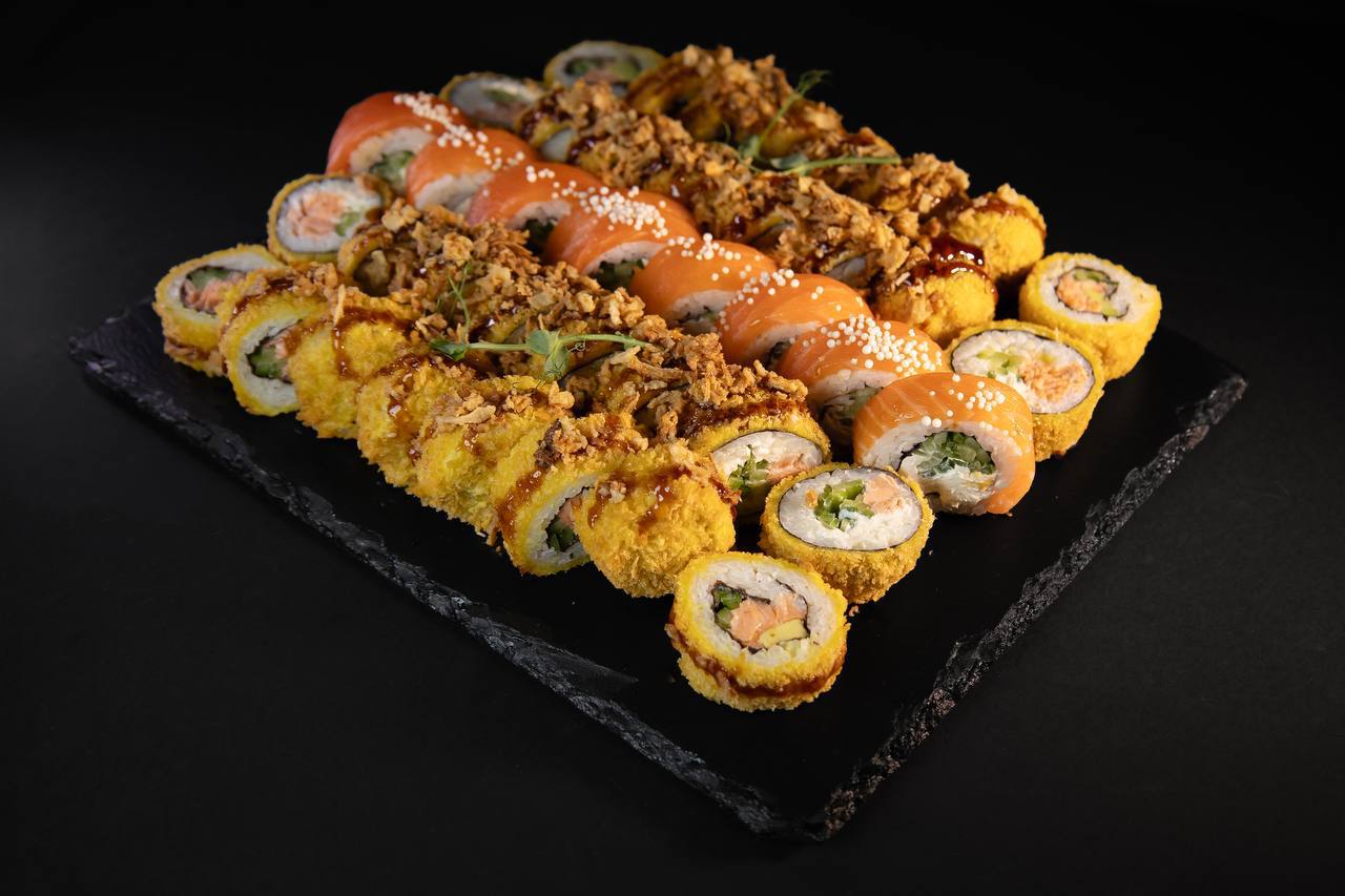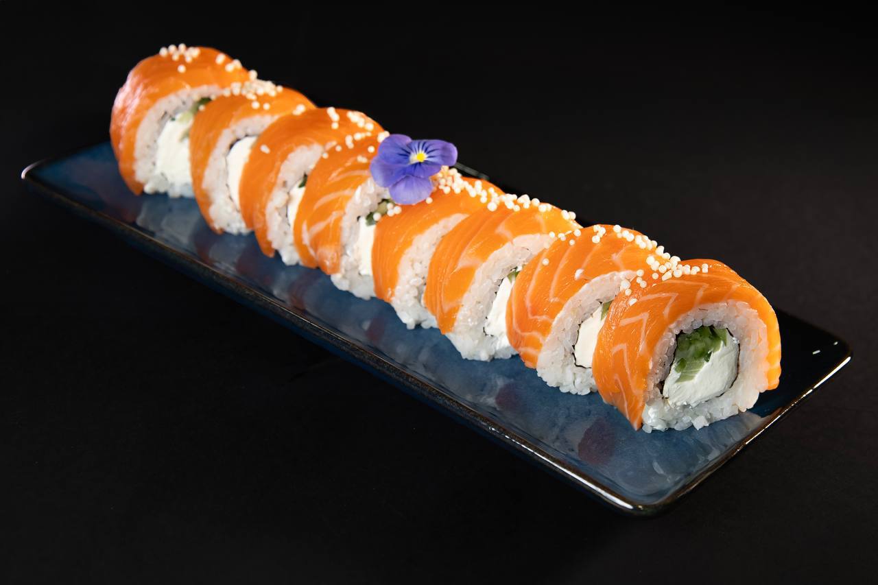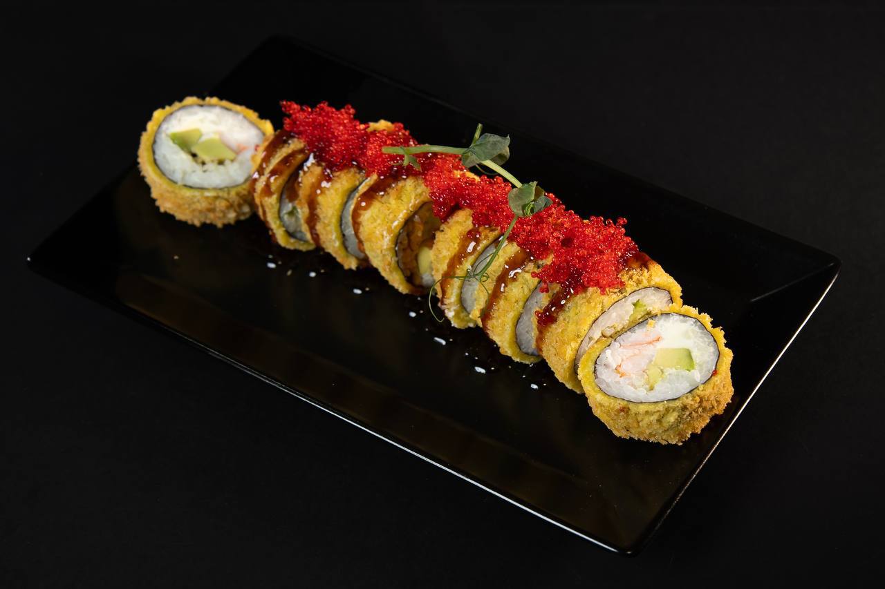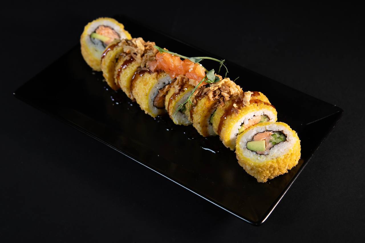 (rýže, nori řasa, losos, avokádo, okurka, smetanový sýr, tempura) 550 g Alergeny: 1, 3, 4, 7