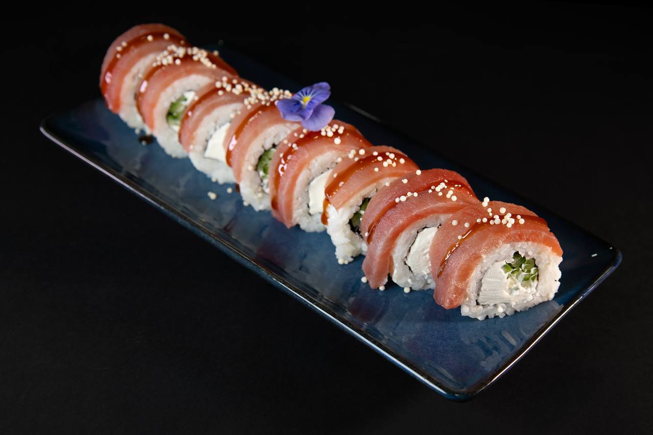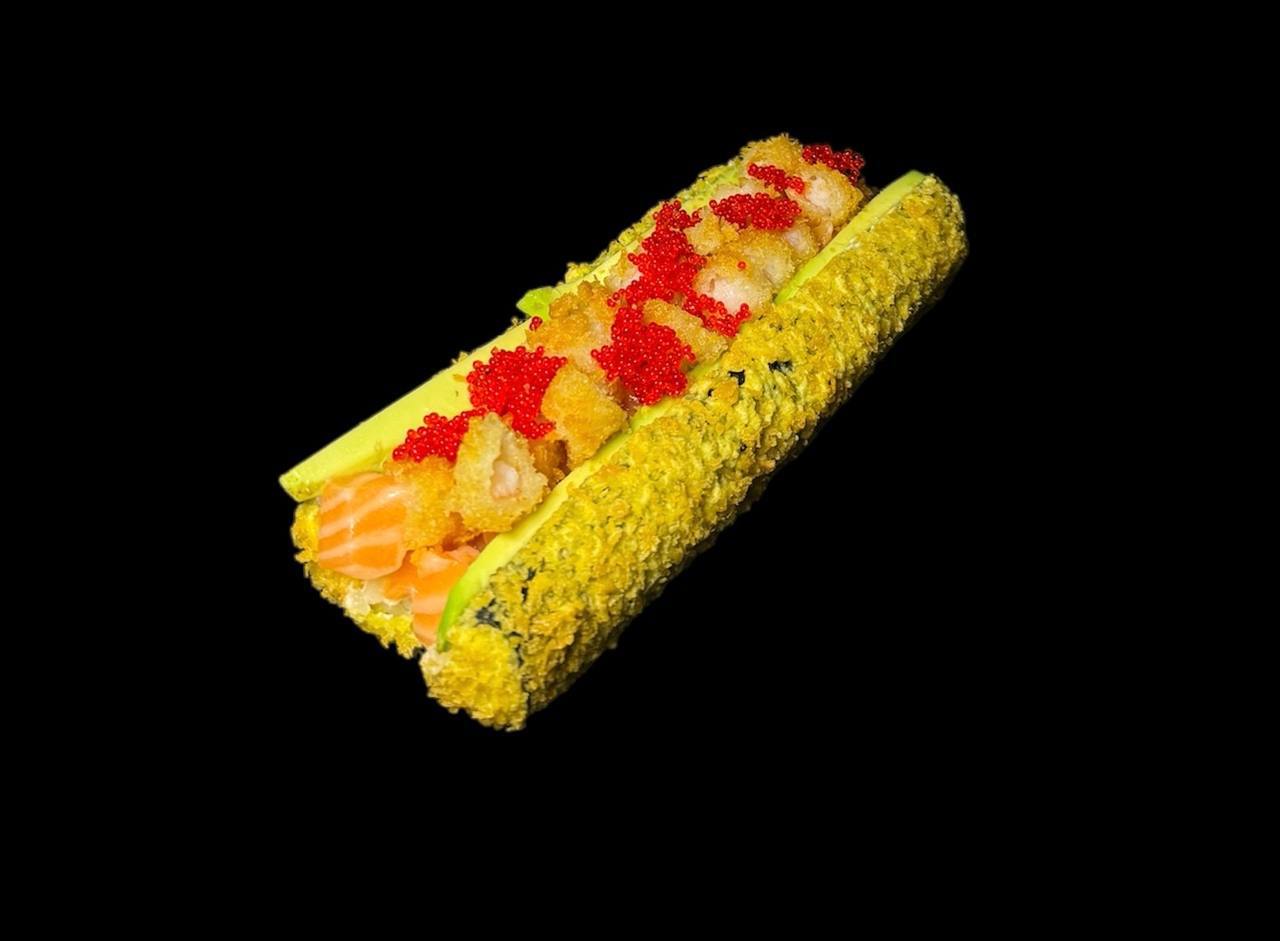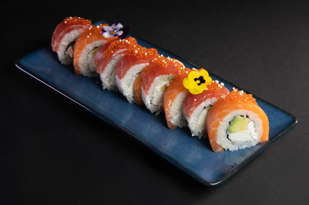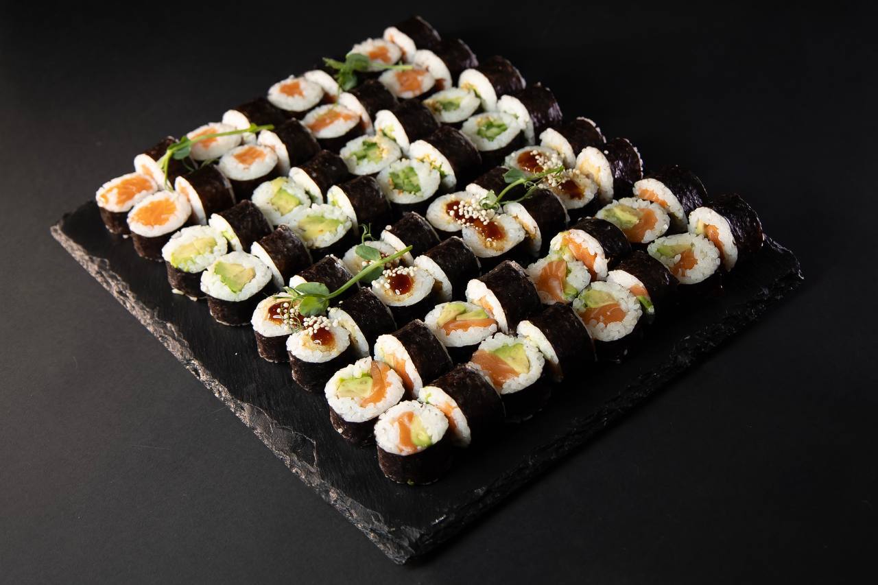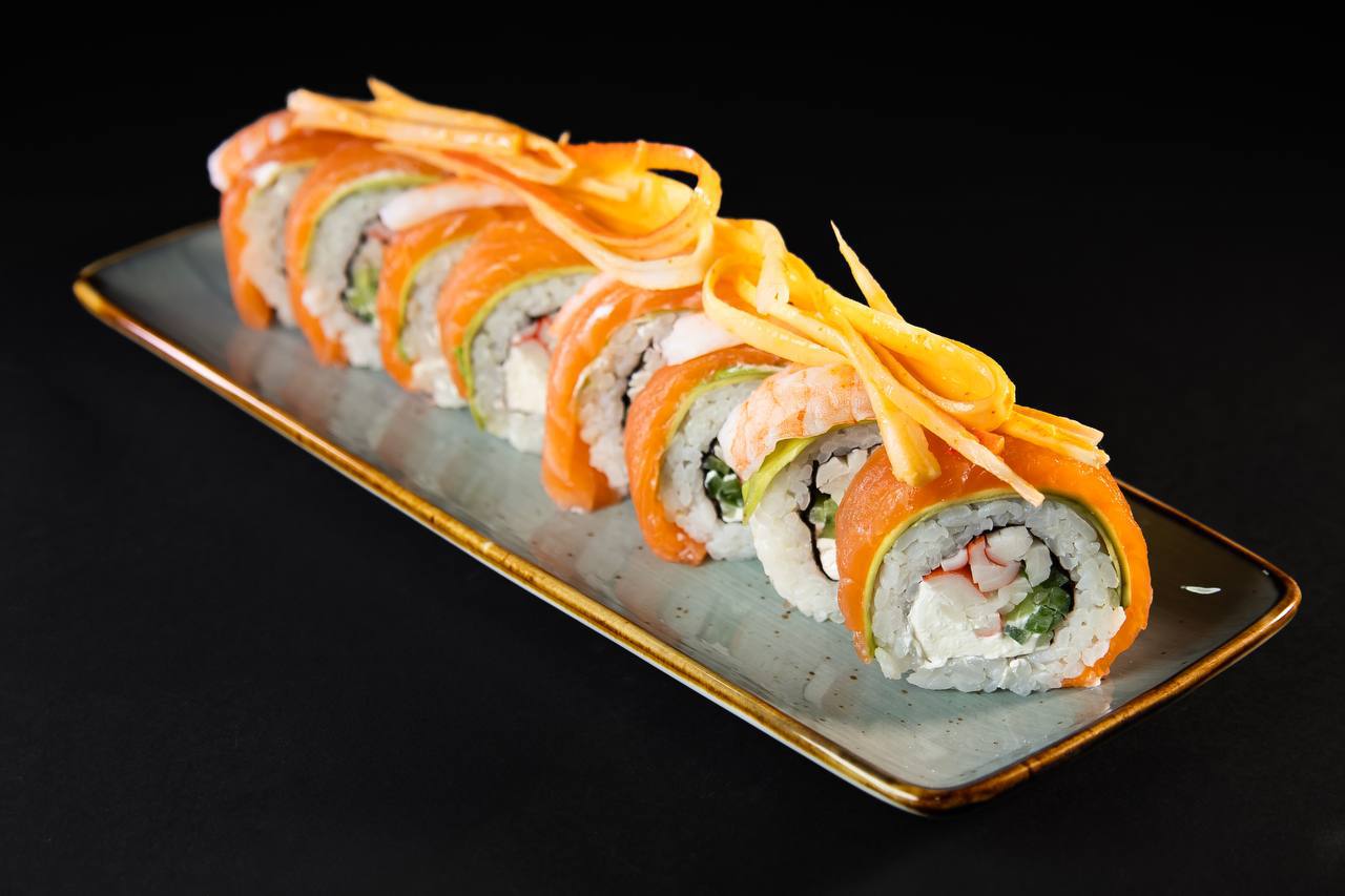 (rýže, nori řasa, losos, avokádo, okurka, smetanový sýr, tempura) 550 g Alergeny: 1, 3, 4, 7