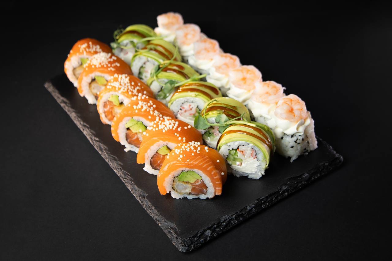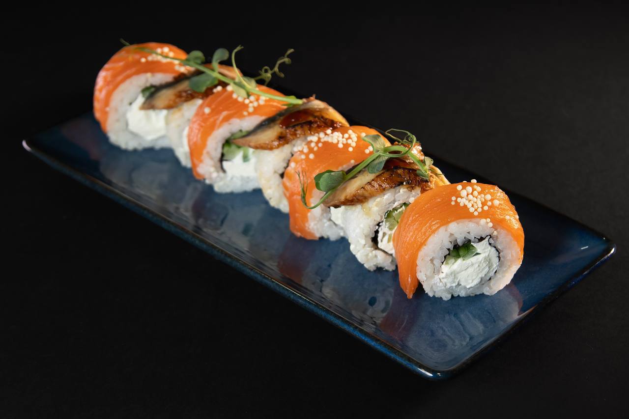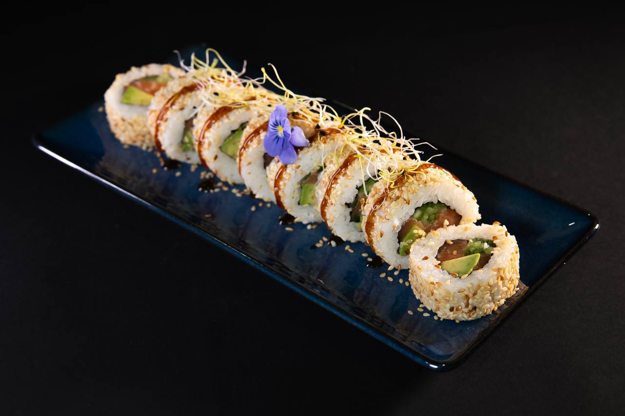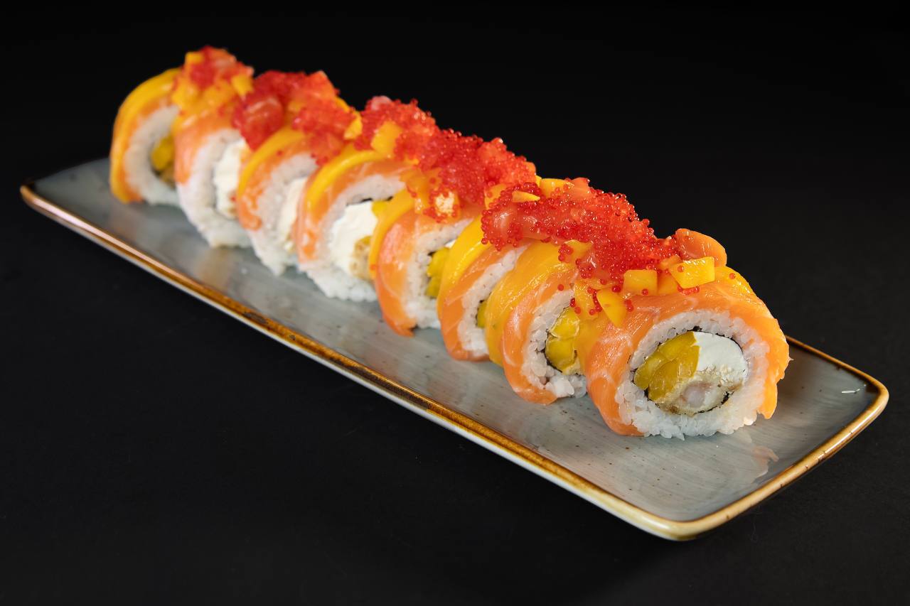 (rýže, nori řasa, losos, avokádo, okurka, smetanový sýr, tempura) 550 g Alergeny: 1, 3, 4, 7