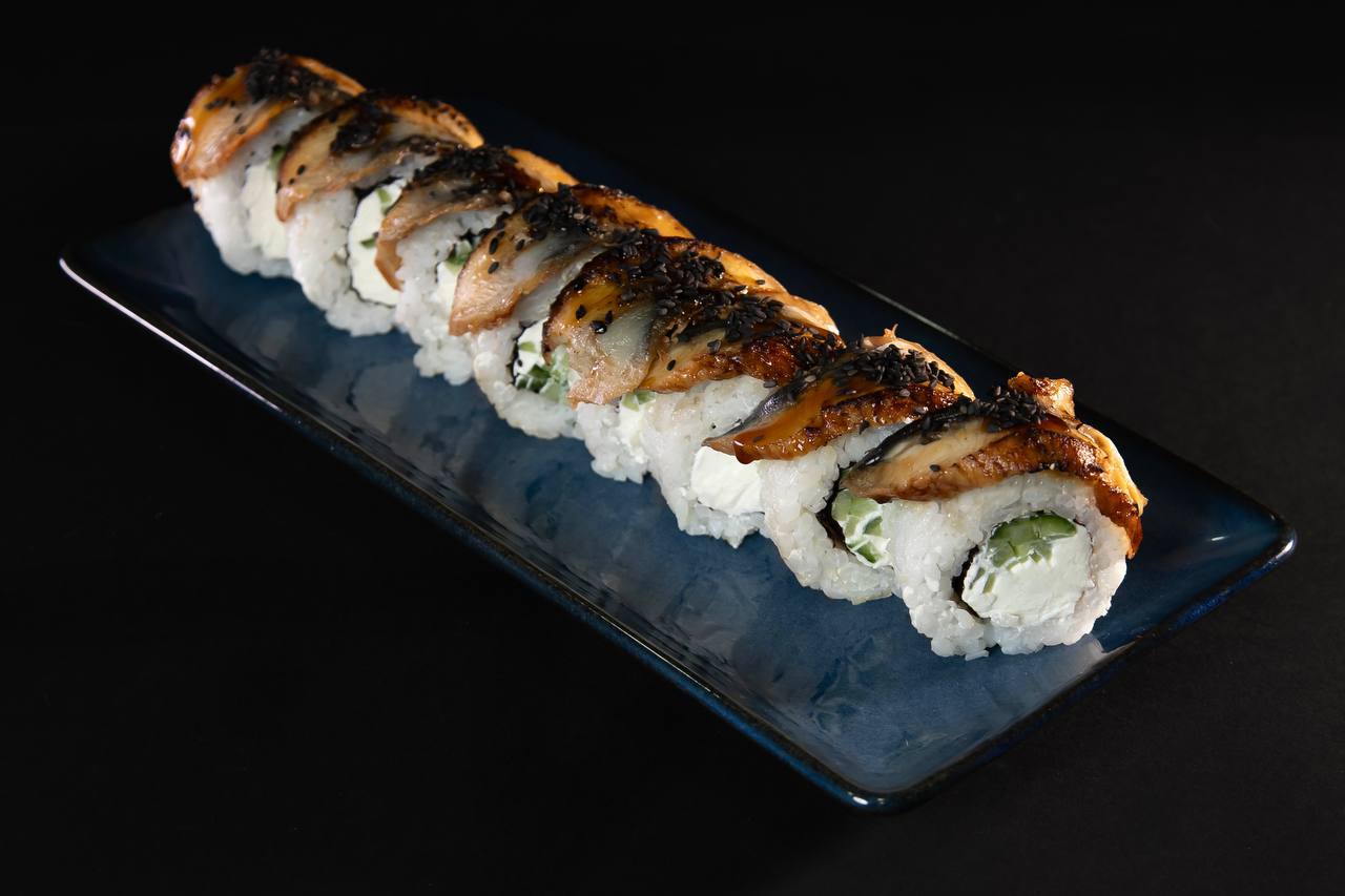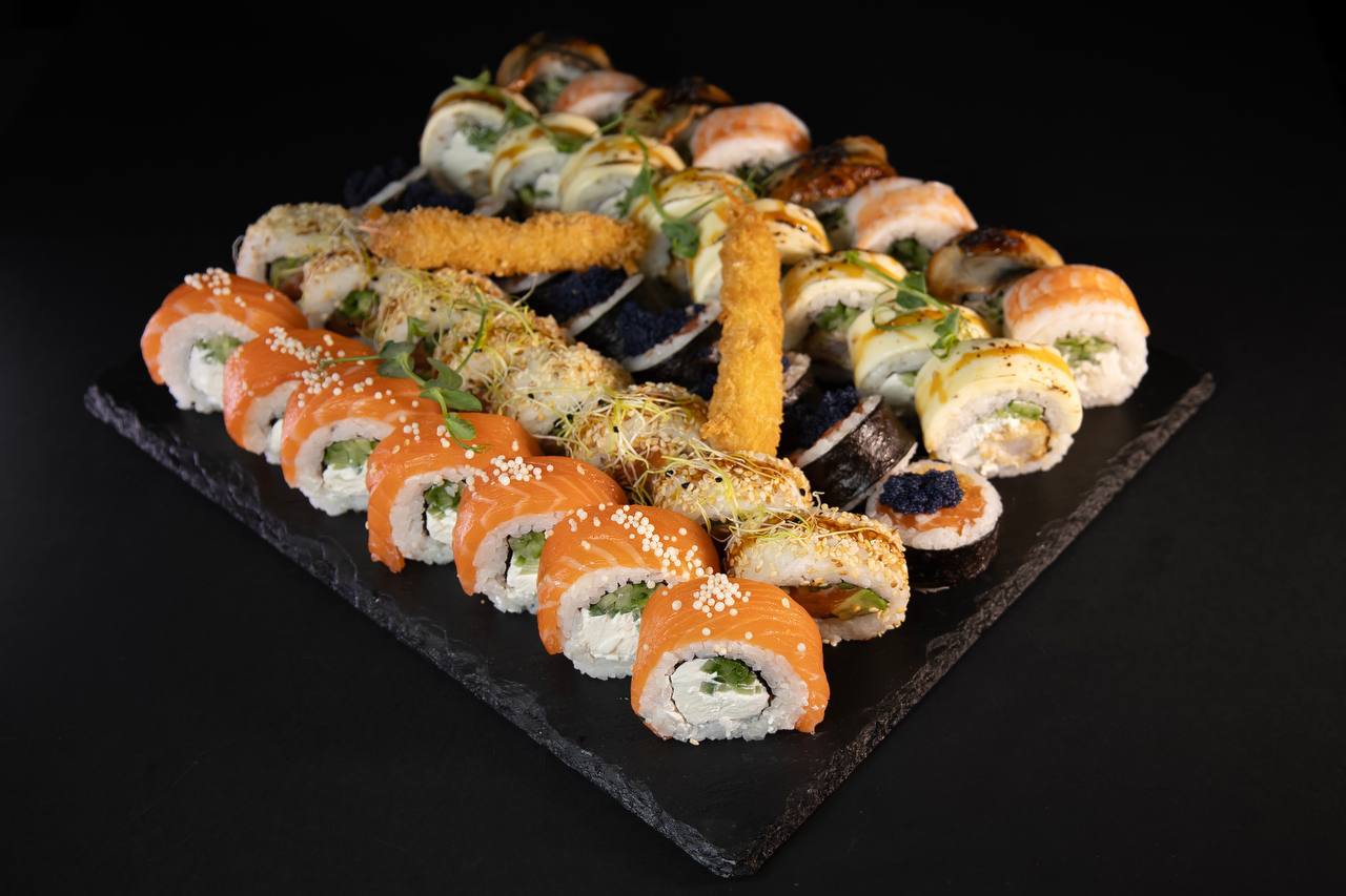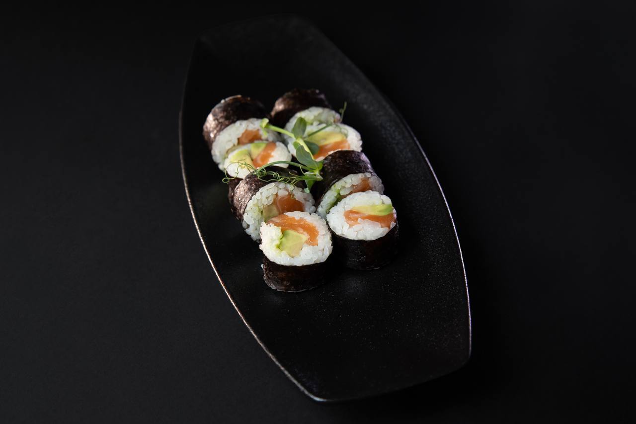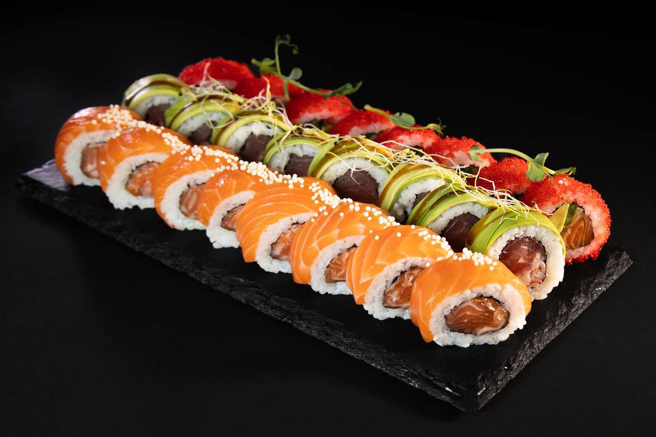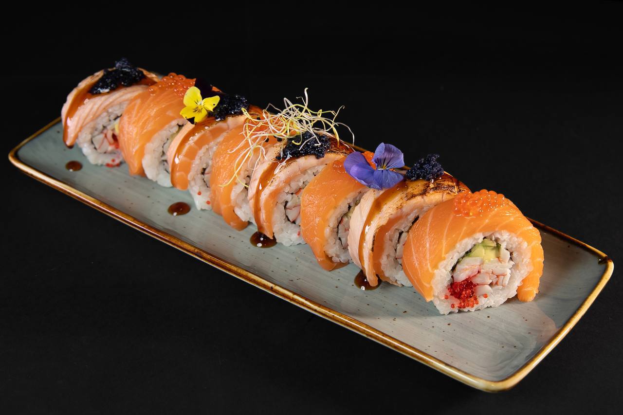 (rýže, nori řasa, losos, avokádo, okurka, smetanový sýr, tempura) 550 g Alergeny: 1, 3, 4, 7