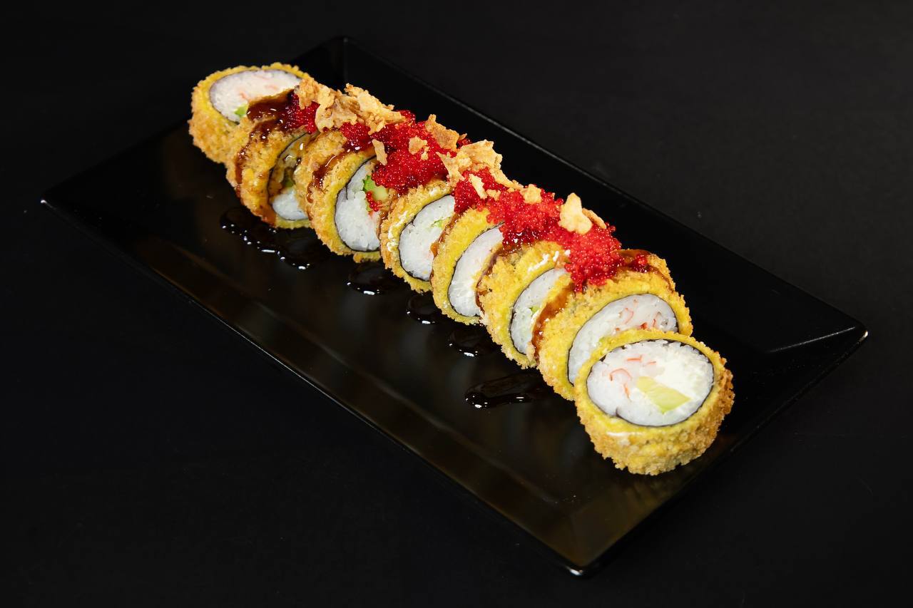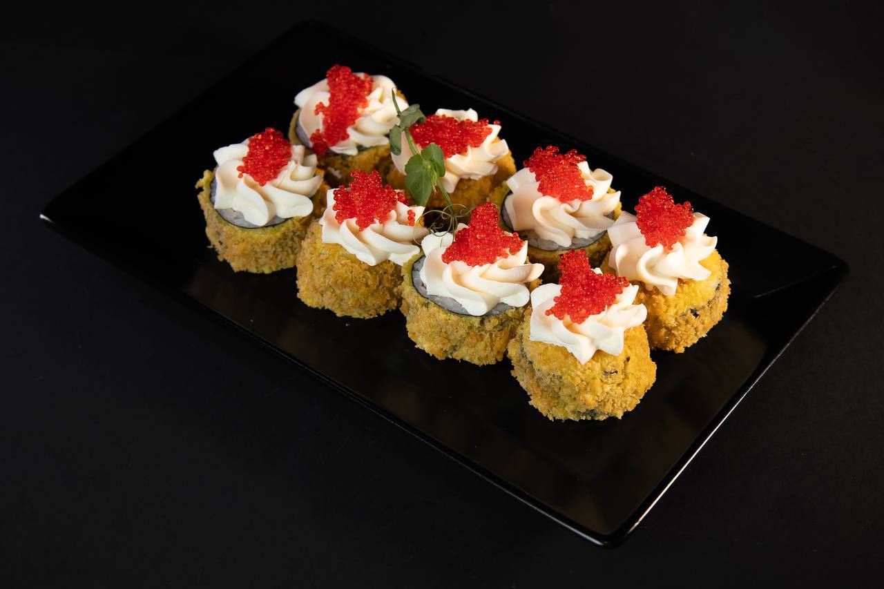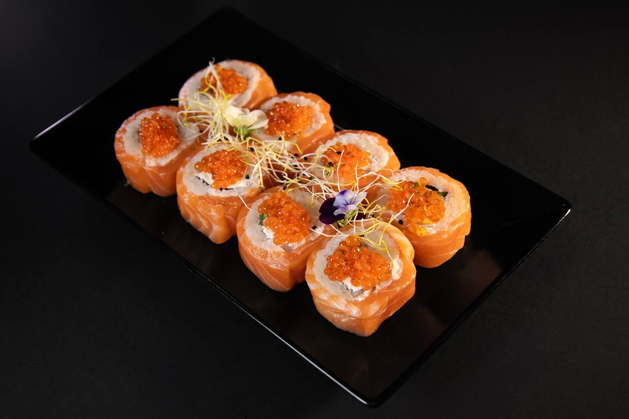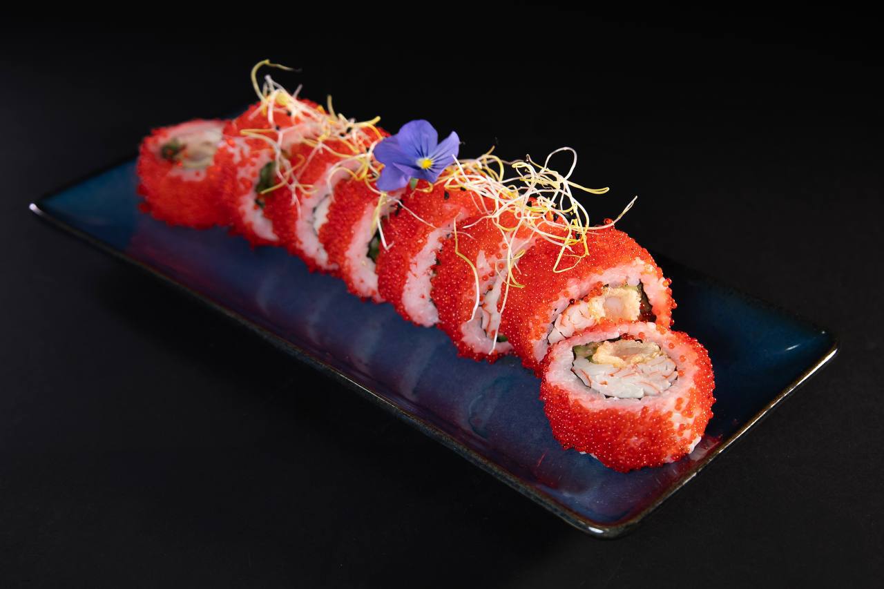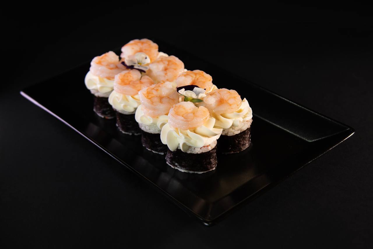 (rýže, řasy, smetanový sýr, losos, avokádo, kreveta v tempuře, tobiko, tempura) 350 g Alergeny: 1, 2, 3, 4, 7