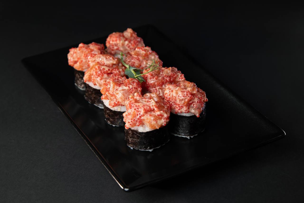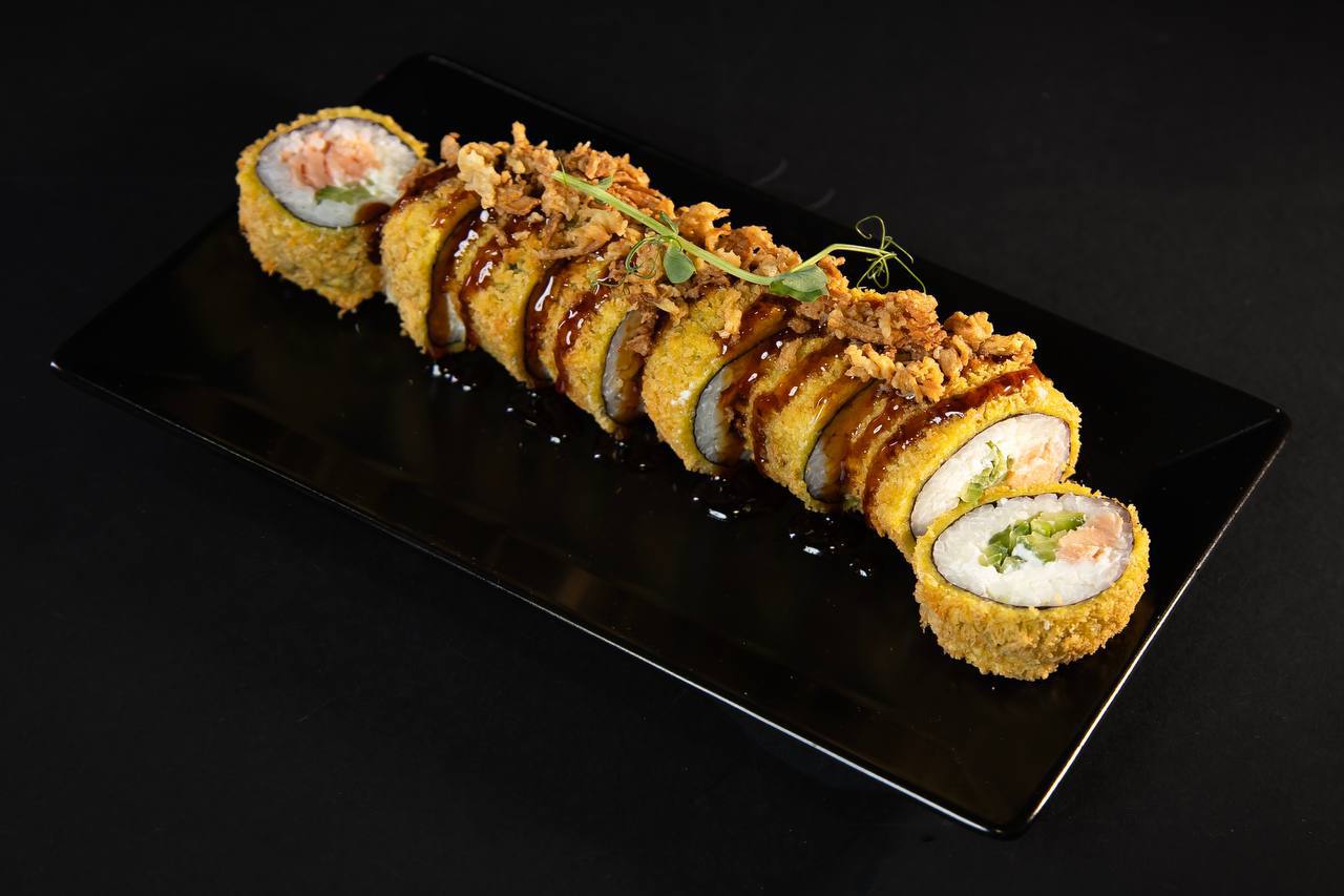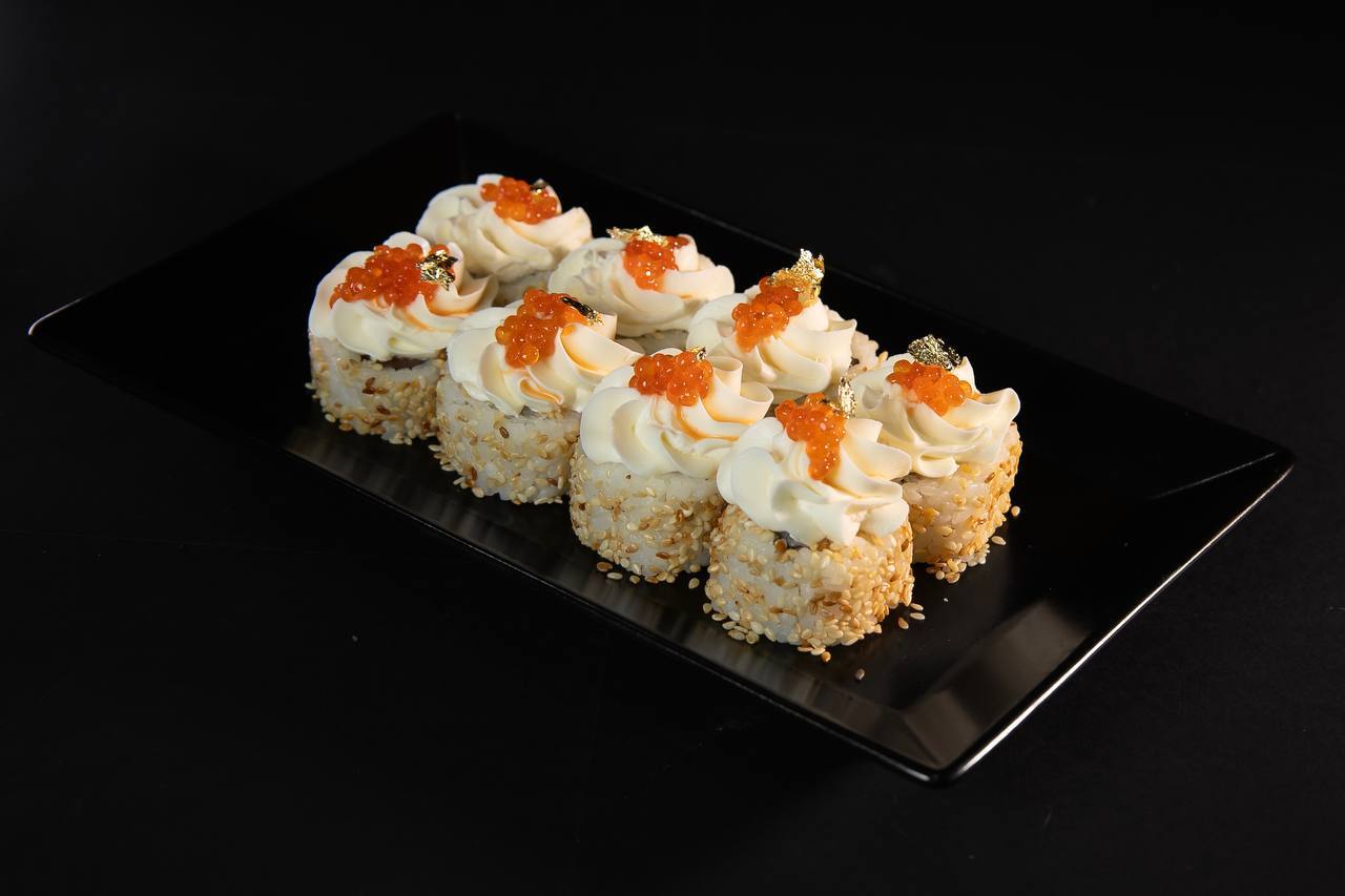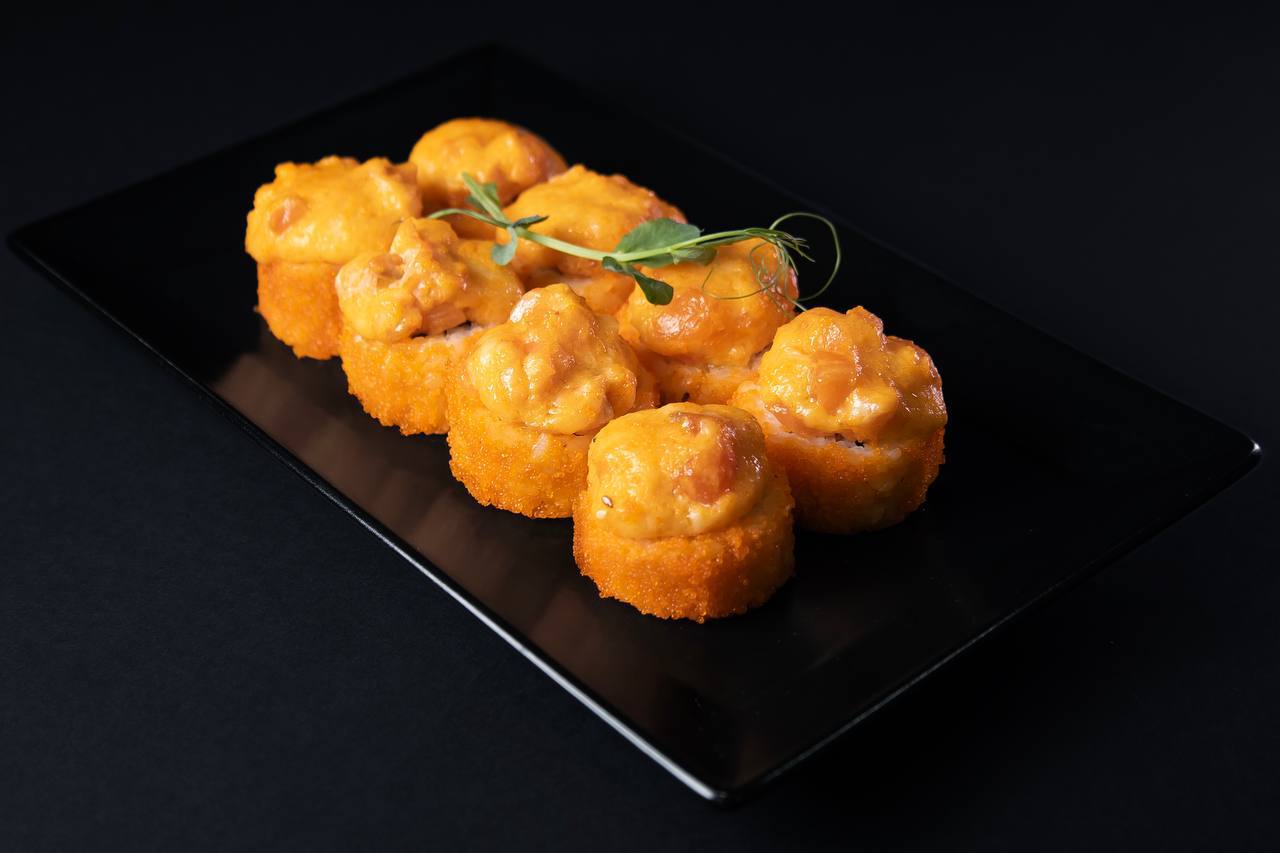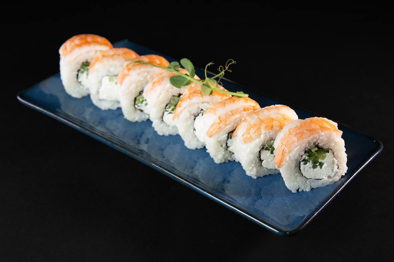 (rýže, řasy, smetanový sýr, losos, avokádo, kreveta v tempuře, tobiko, tempura) 350 g Alergeny: 1, 2, 3, 4, 7
