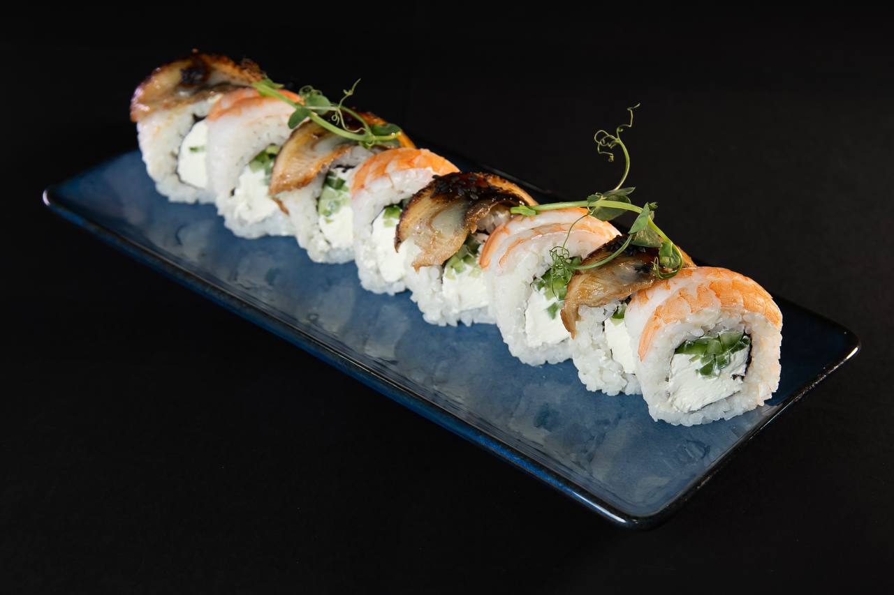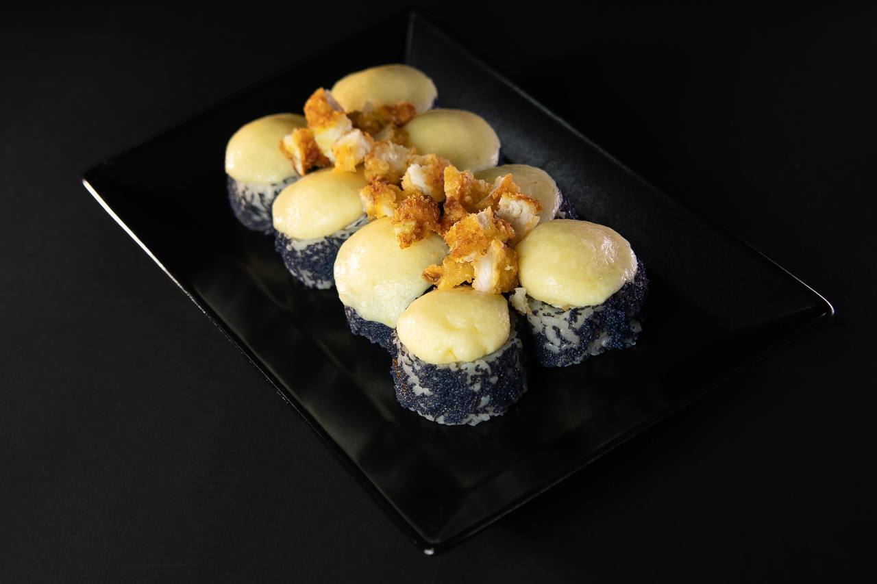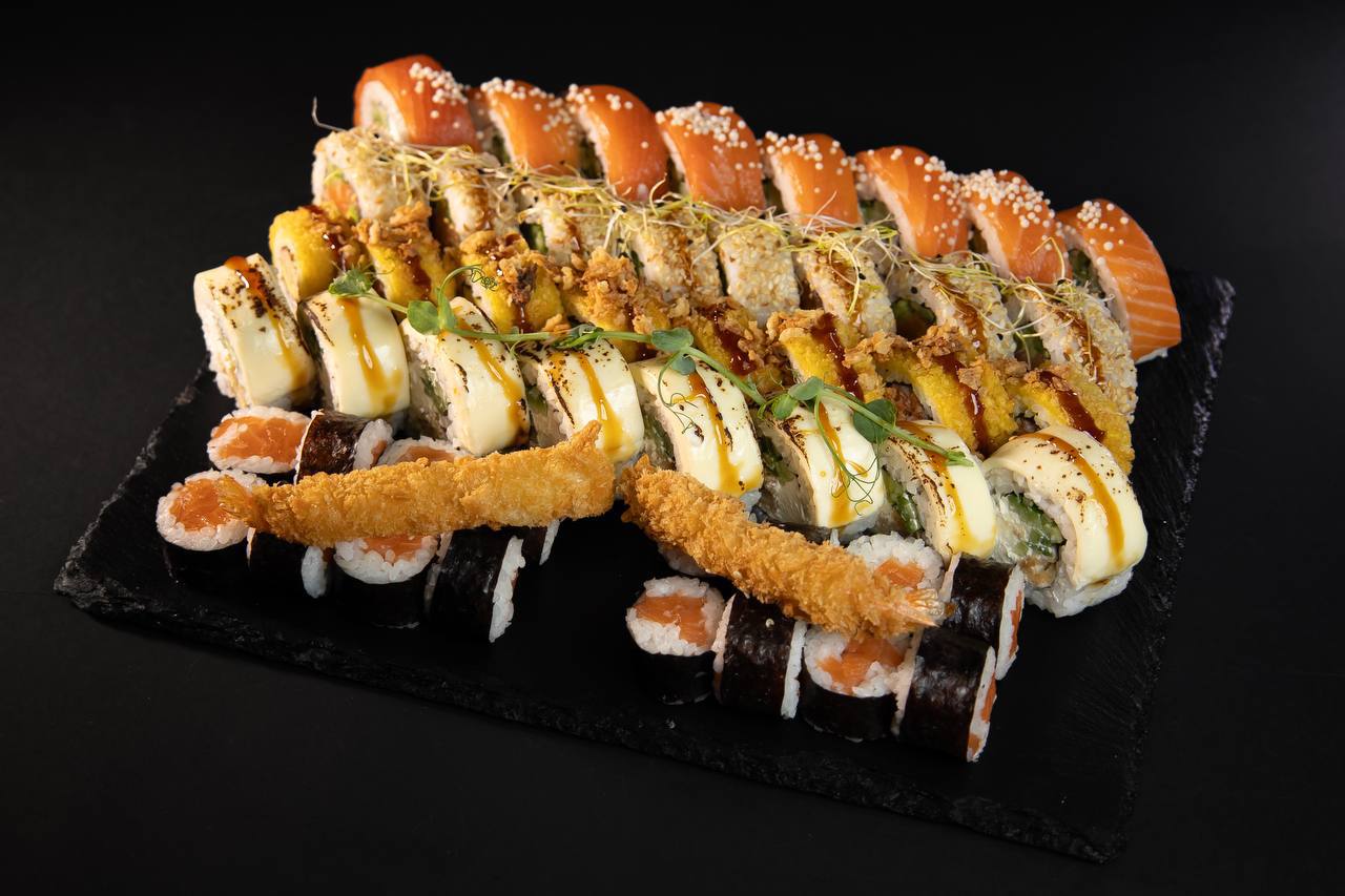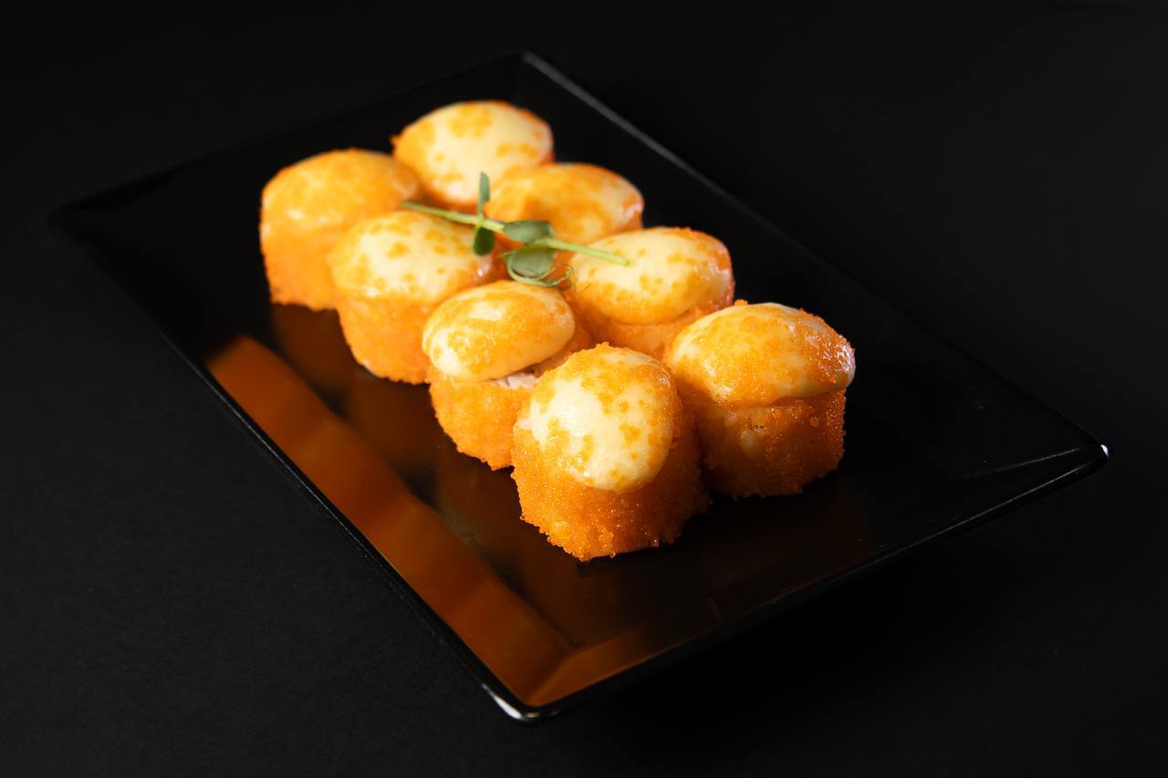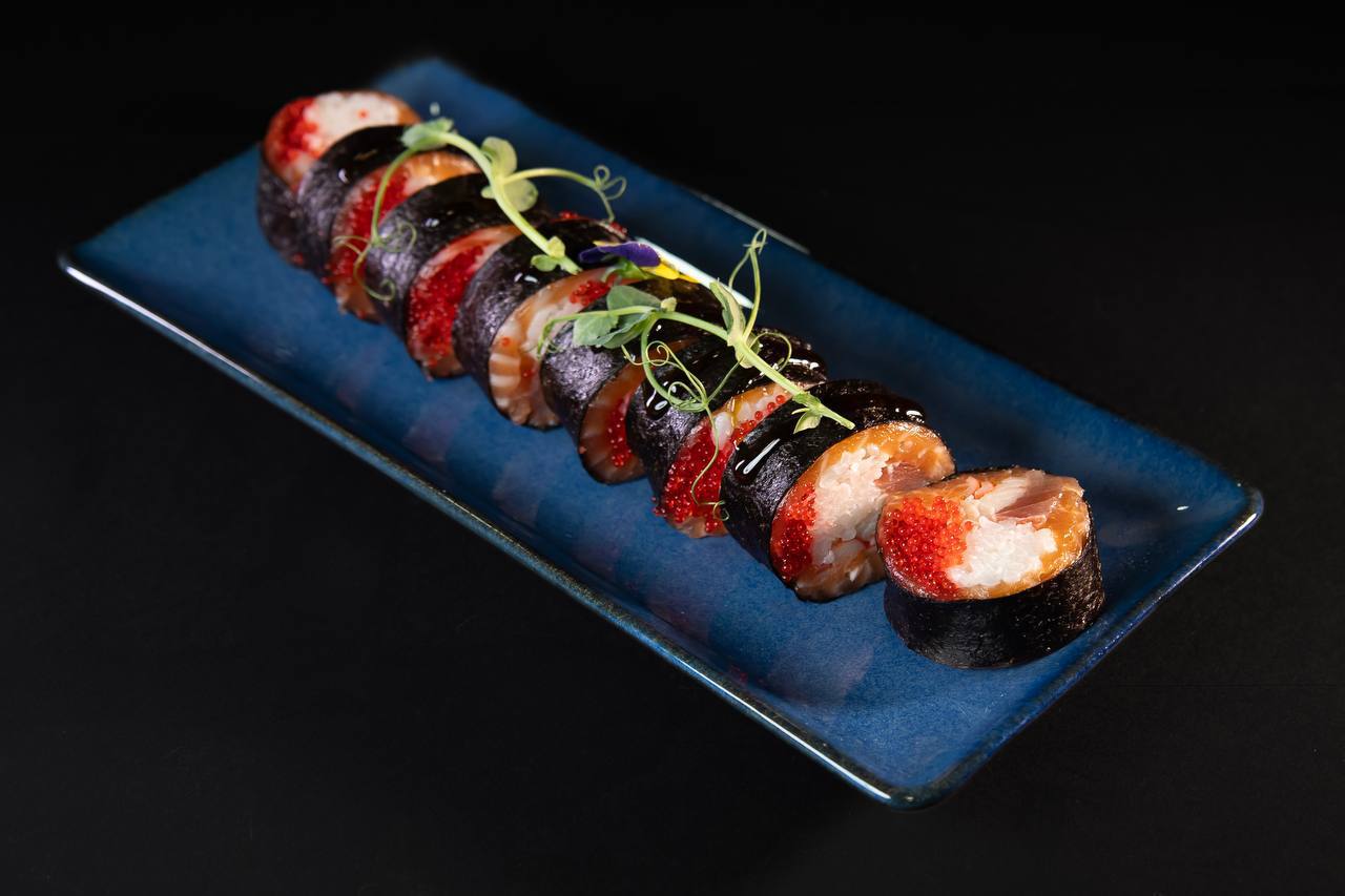 (rýže, řasy, smetanový sýr, losos, avokádo, kreveta v tempuře, tobiko, tempura) 350 g Alergeny: 1, 2, 3, 4, 7