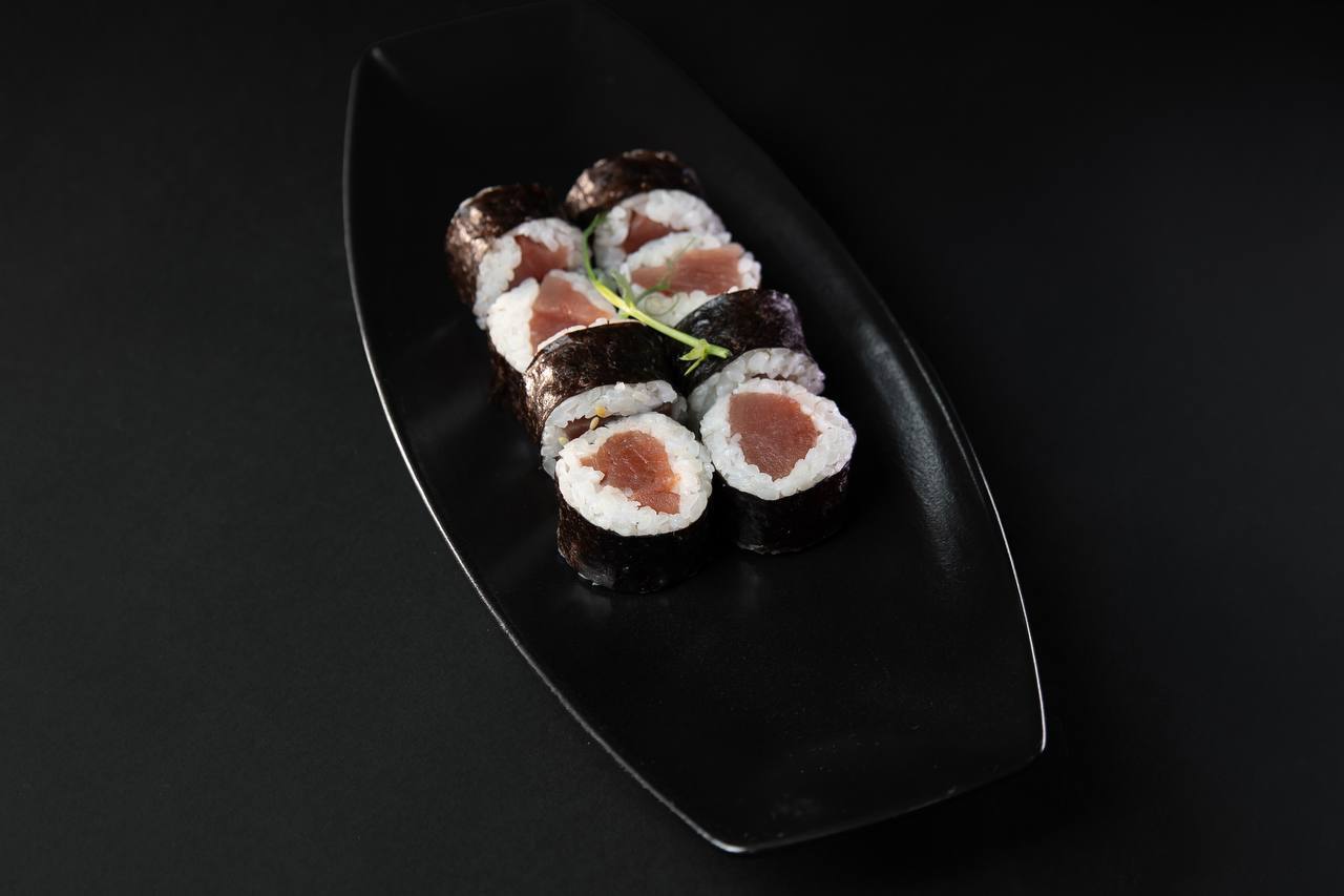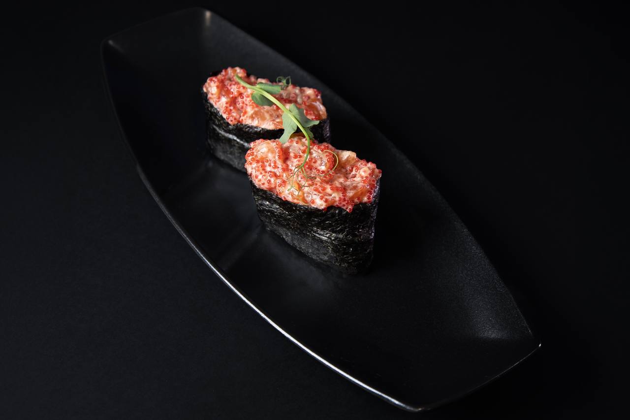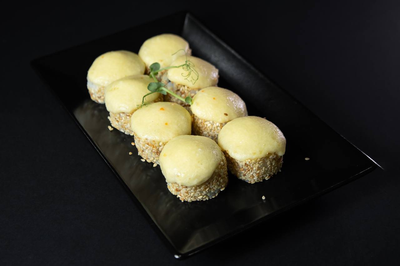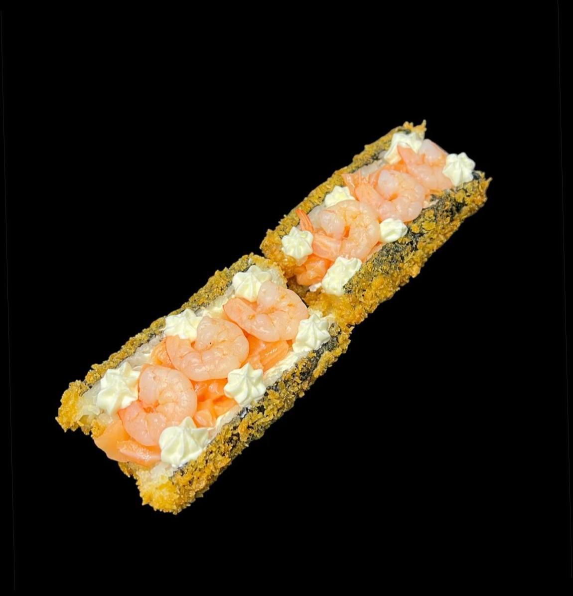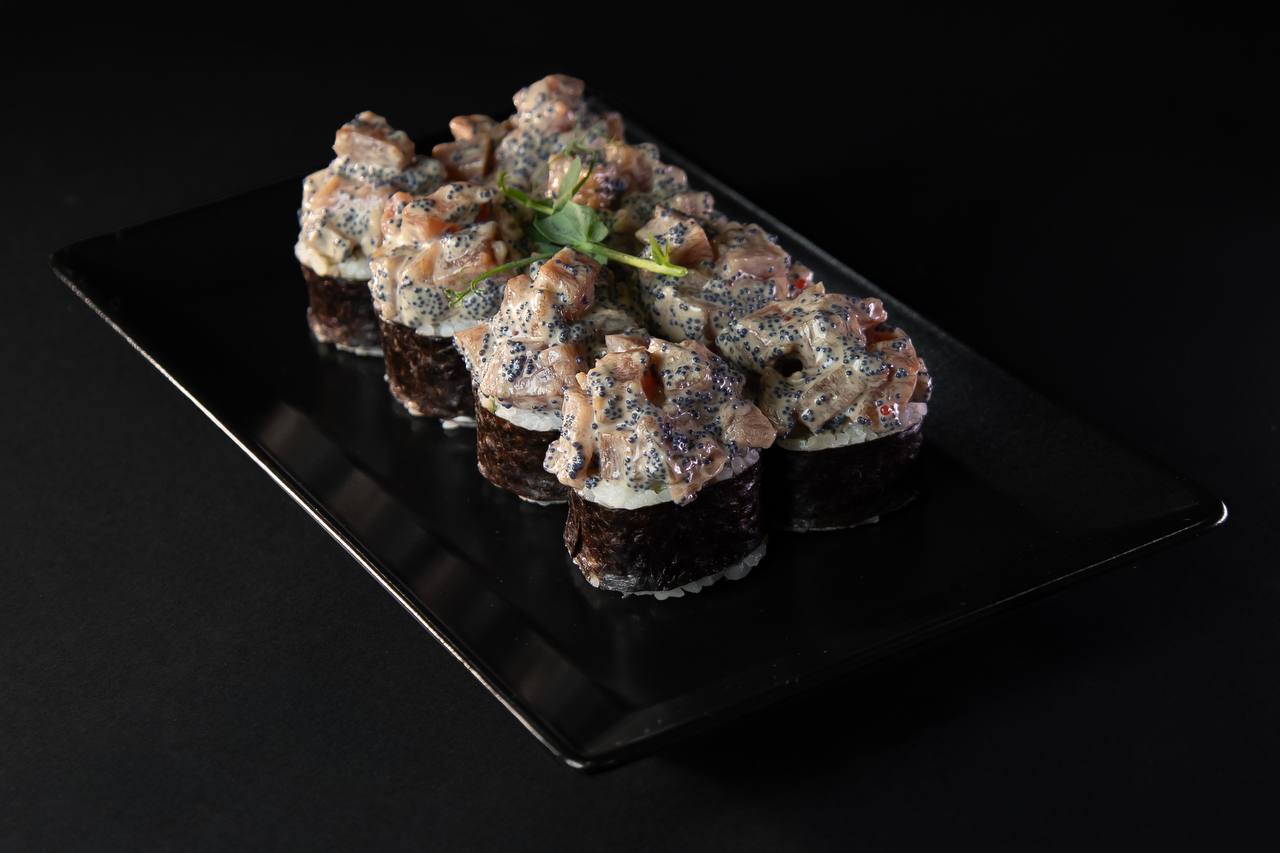 (rýže, řasy, smetanový sýr, losos, avokádo, kreveta v tempuře, tobiko, tempura) 350 g Alergeny: 1, 2, 3, 4, 7