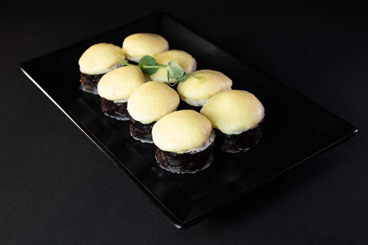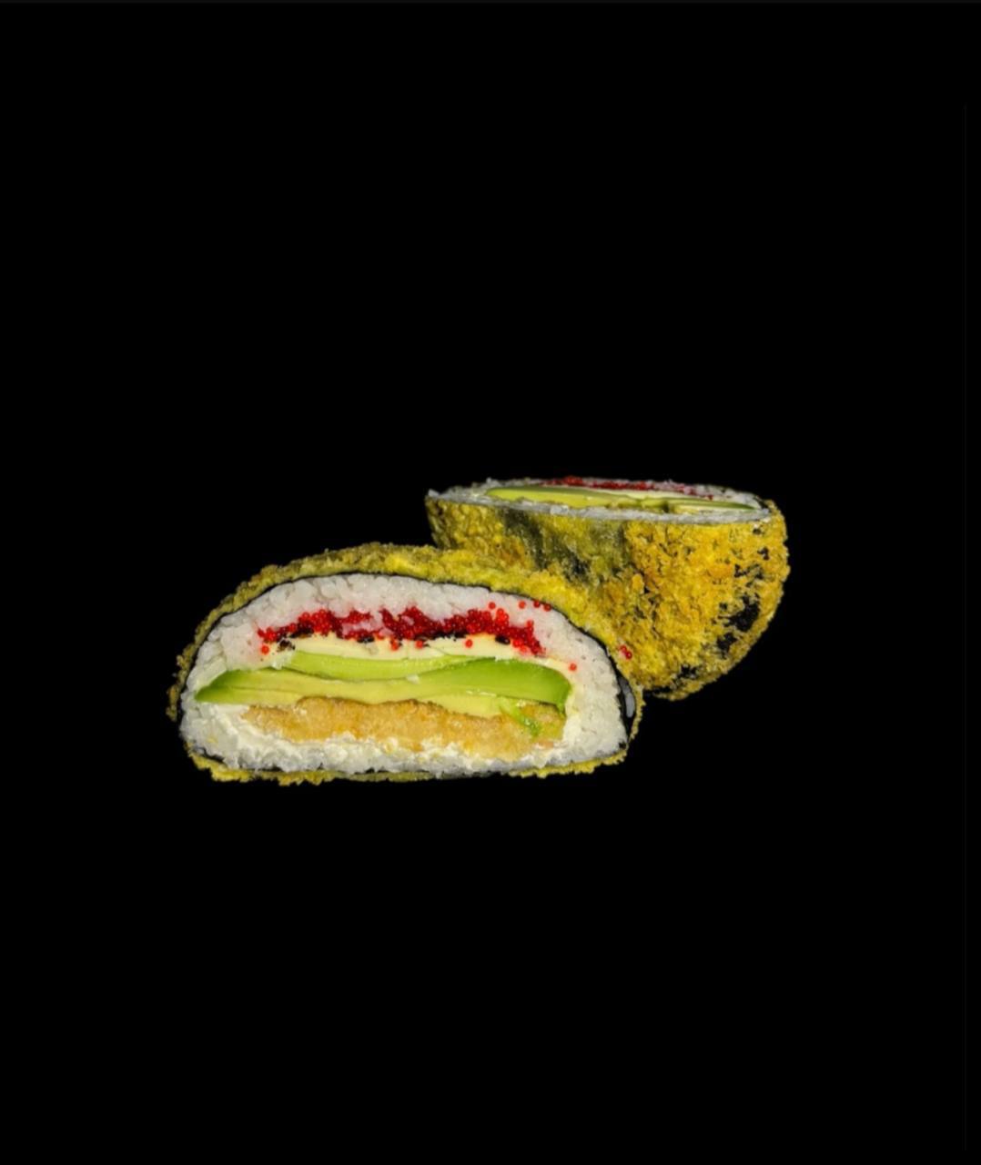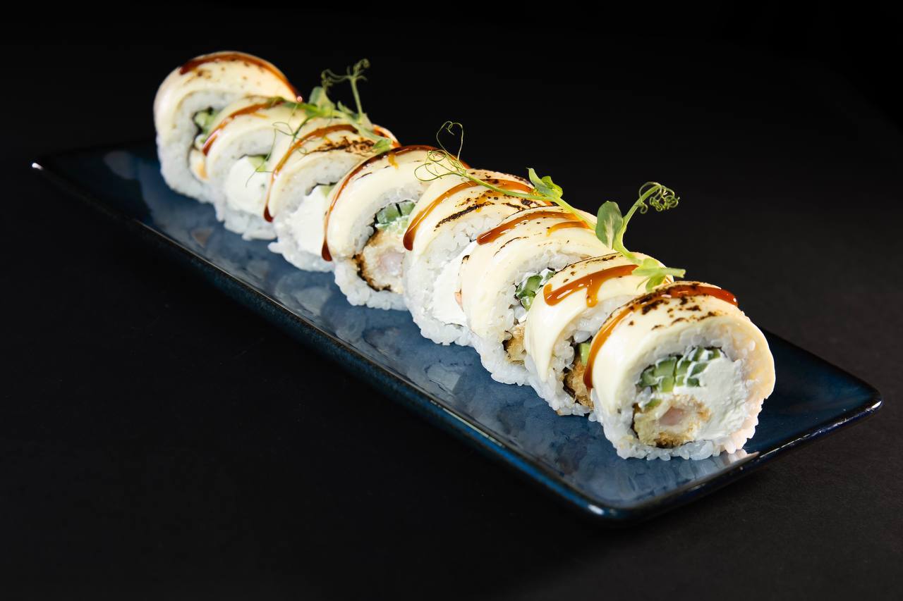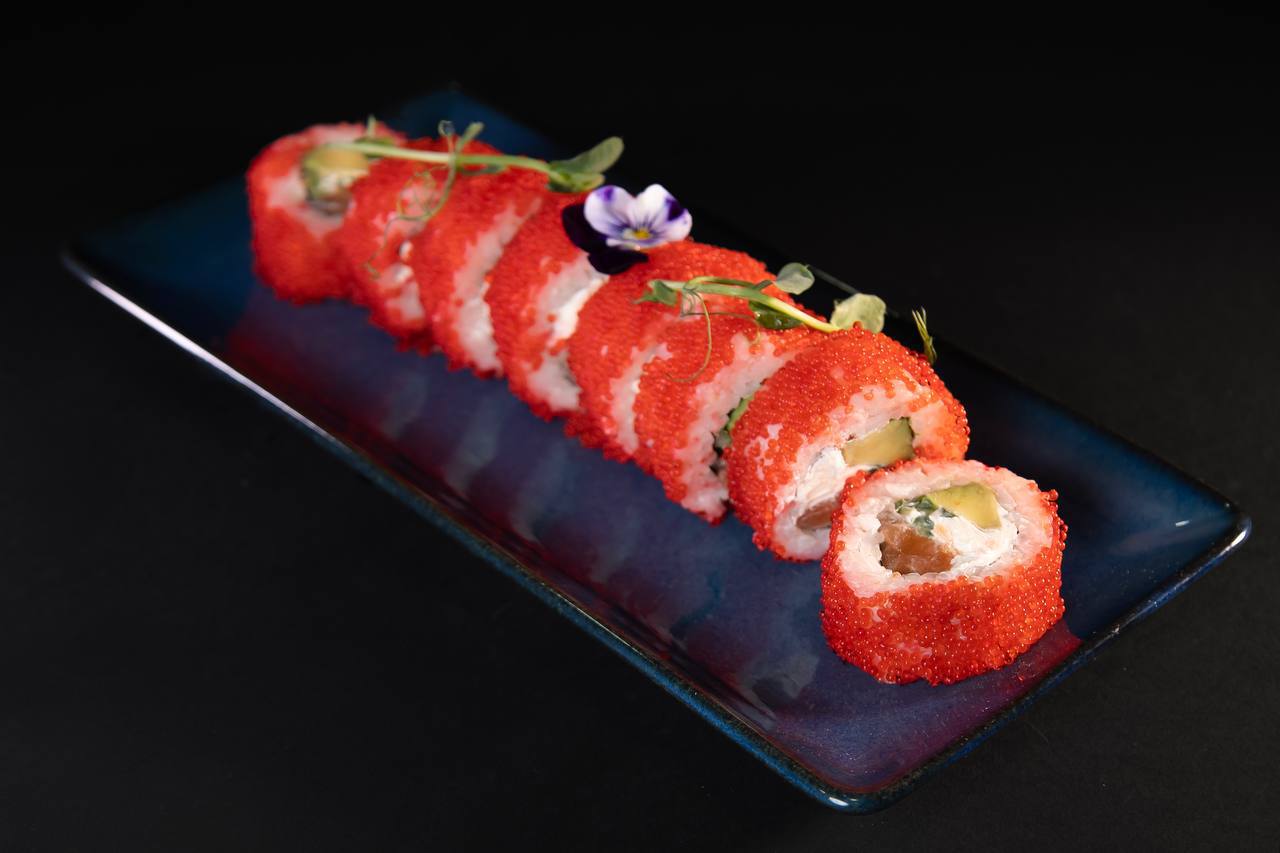 (rýže, nori řasa, kreveta v tempuře, avokádo, sýr Emmental, smetanový sýr, tobiko, obal) 550 g