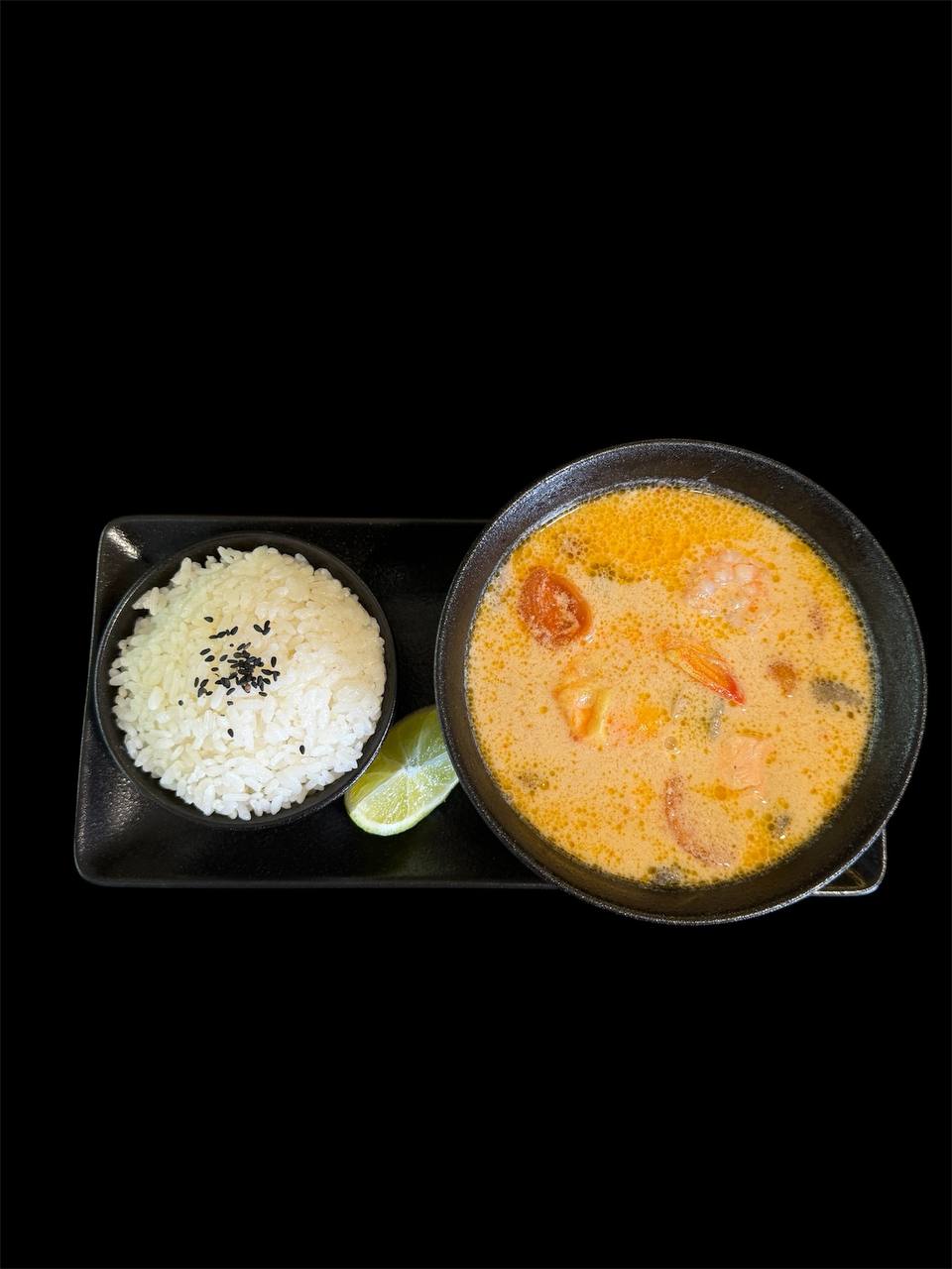 Tom Yum (autorský vývar, krevety, losos, žampiony, kokosové mléko, rajčata, tom yum pasta, zelenina, rýže a limetka) – 260 Kč 1,2,4,6,7